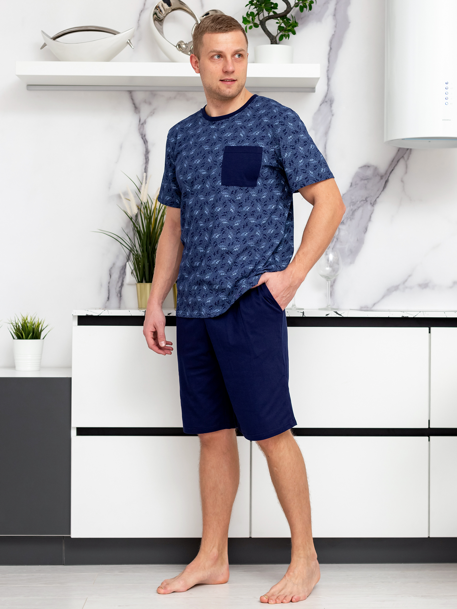 Комплект мужской для дома состоит и шорт домашних с вместительными карманами, в которые удобно положить телефон, деньги, ключи и т.д, пояс на широкой резинке, которая хорошо зафиксирована, благодаря этому не перекручивается внутри и футболки с короткими втачными рукавами и накладным карманом на груди горловина округлая.